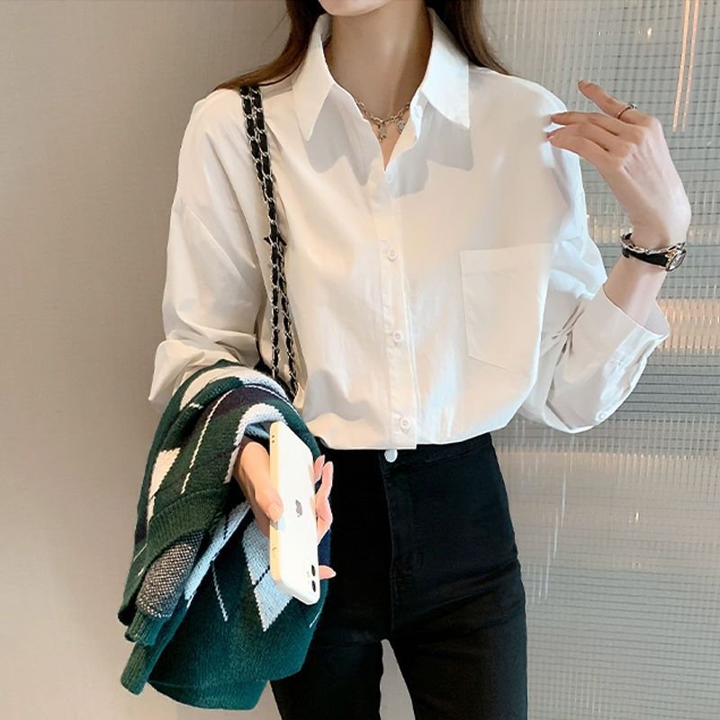 Camisa blanca de algodón puro para mujer, nueva sensación de diseño, blusa de nicho, camisa de fondo informal, camisa de manga larga de todo fósforo